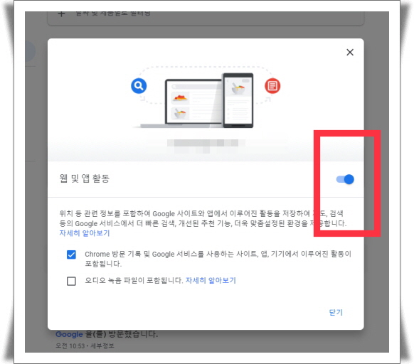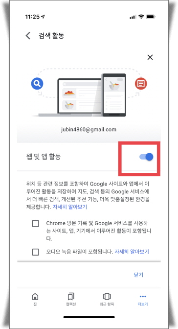 4. PC버전과 동일합니다. 웹 및 앱 활동 부분이 파란색으로 활성화되어있습니다.