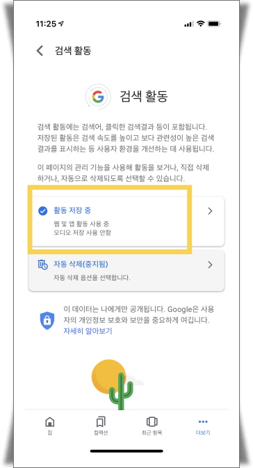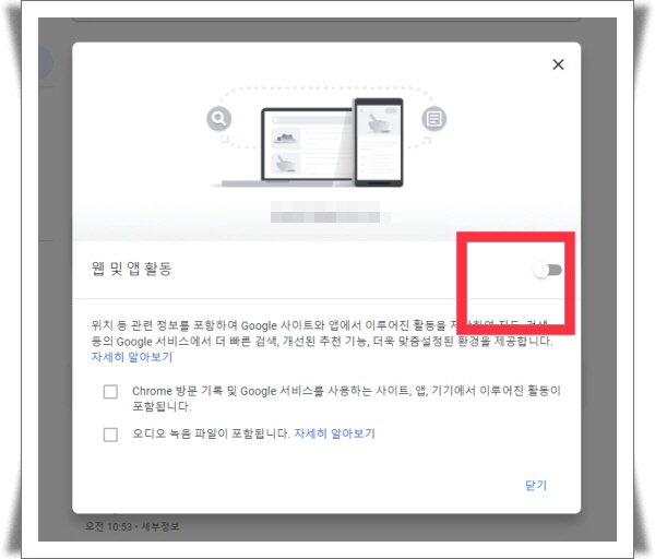 6. 웹 및 앱 활동 부분이 회색으로 비활성화된 것을 확인할 수 있습니다.